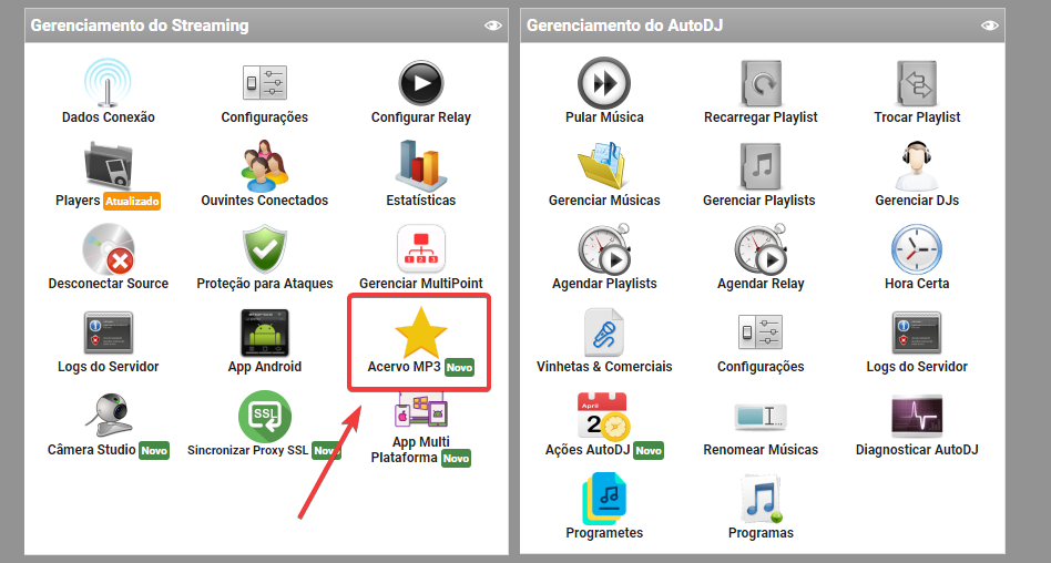 1- Para acessar o acervo mp3 disponível em seu painel streaming, clique no ícone de estrela em seu painel: