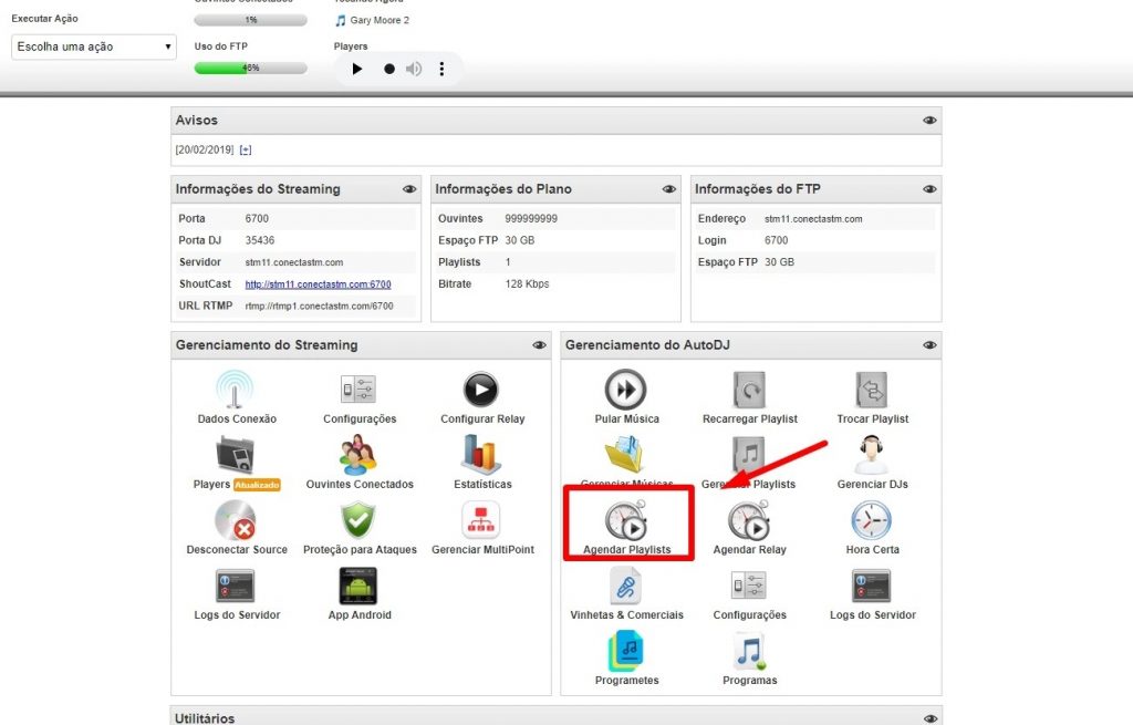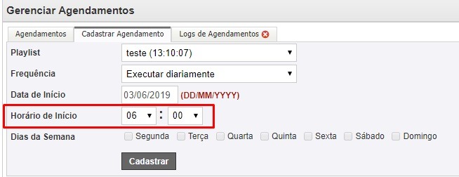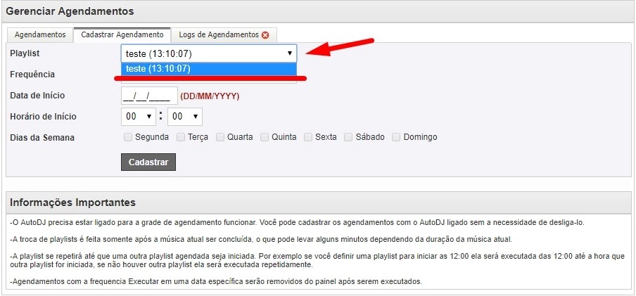 – O agendamento serve para definir o horário de inicio de sua playlist e não do termino da reprodução dela, então é importante verificar a duração de sua playlist para que a programação de uma não sobrescreva a outra. O autoDJ só iniciará um agendamento cadastrado caso a ultima playlist cadastrada tenha chegado ao fim de sua reprodução.