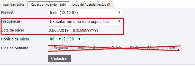 Opção 1Executar em data específica: Esta é mais indicada para casos em que você desejar reproduzir uma playlist em uma única vez, como por exemplo um conteúdo específico que será reproduzido de forma especial em sua rádio; Veja: