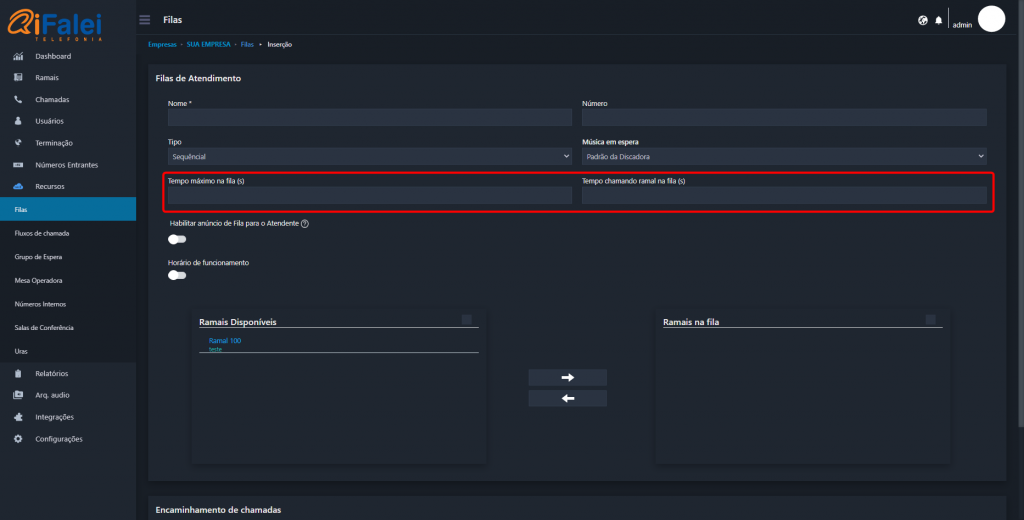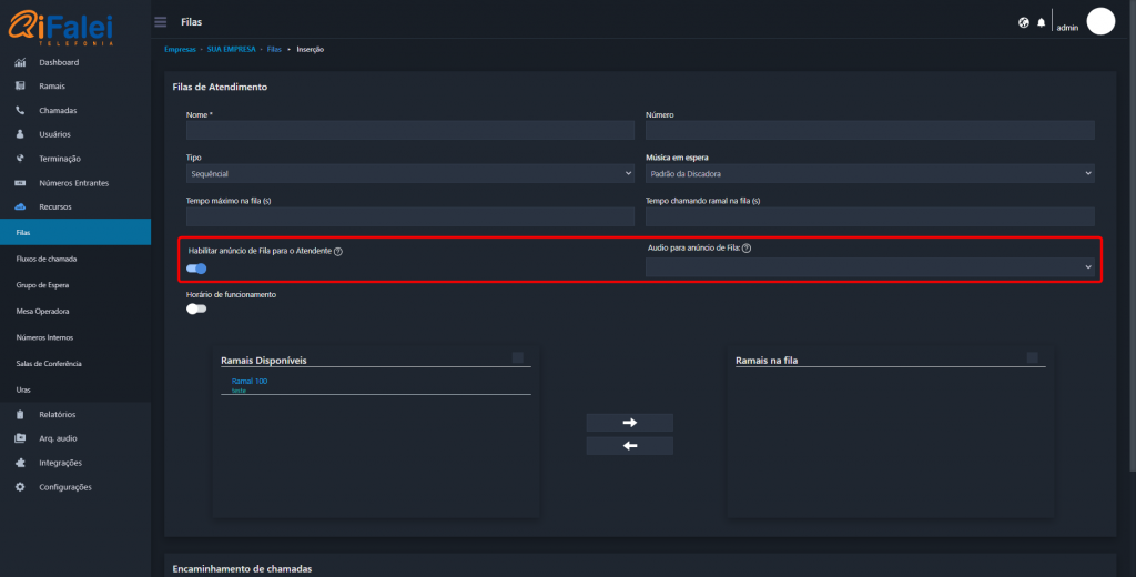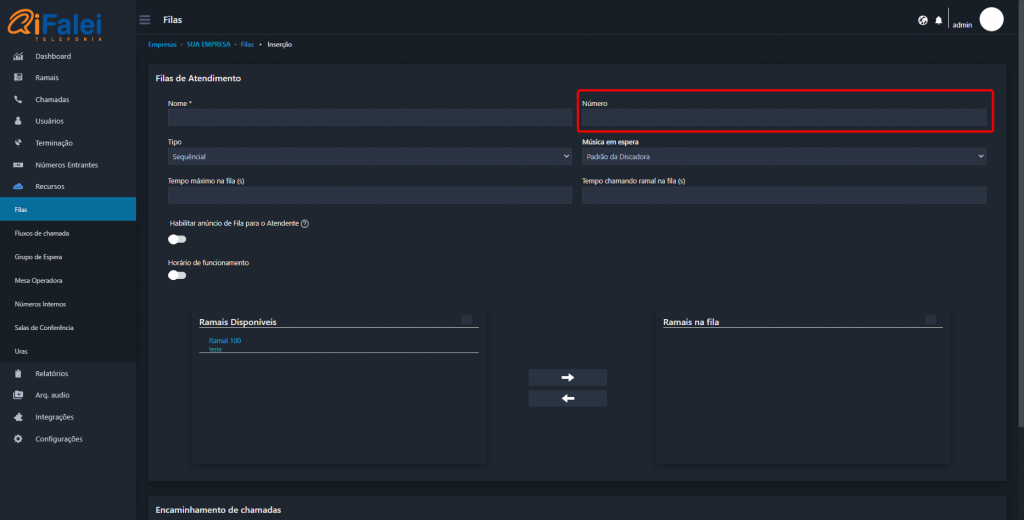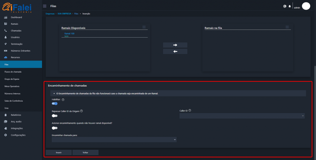 IMPORTANTE: O Encaminhamento de chamadas da fila não funcionará caso a chamada seja encaminhada de um Ramal.