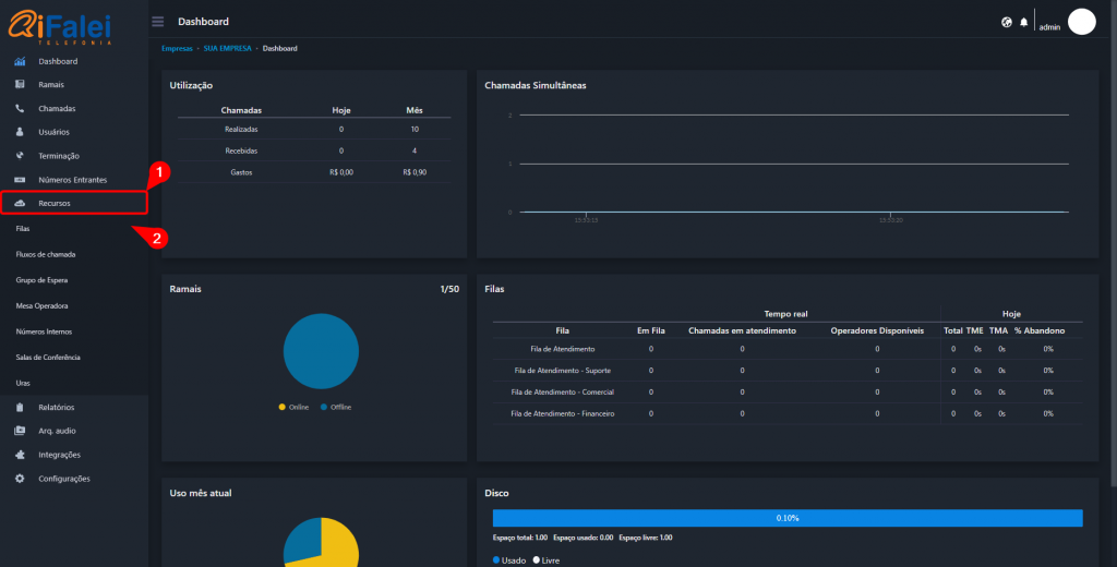 1 – Para criar uma fila de atendimento em seu painel PABX, primeiramente acesse a aba “Recursos” e logo em seguida a opção “Filas”.