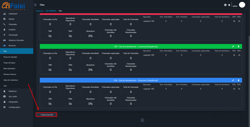 2 – Agora, basta clicar em “+Inserir nova Fila” ao fim da tela.