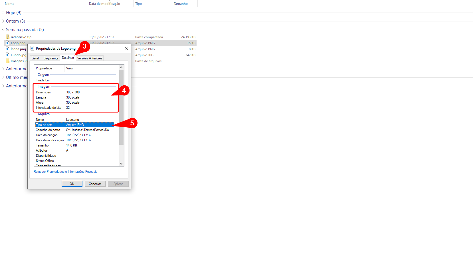 DICA! Para saber se o formato e as dimensões da imagem estão corretas siga esses passos, clique com o botão direito do mouse sobre o arquivo, em seguida :
