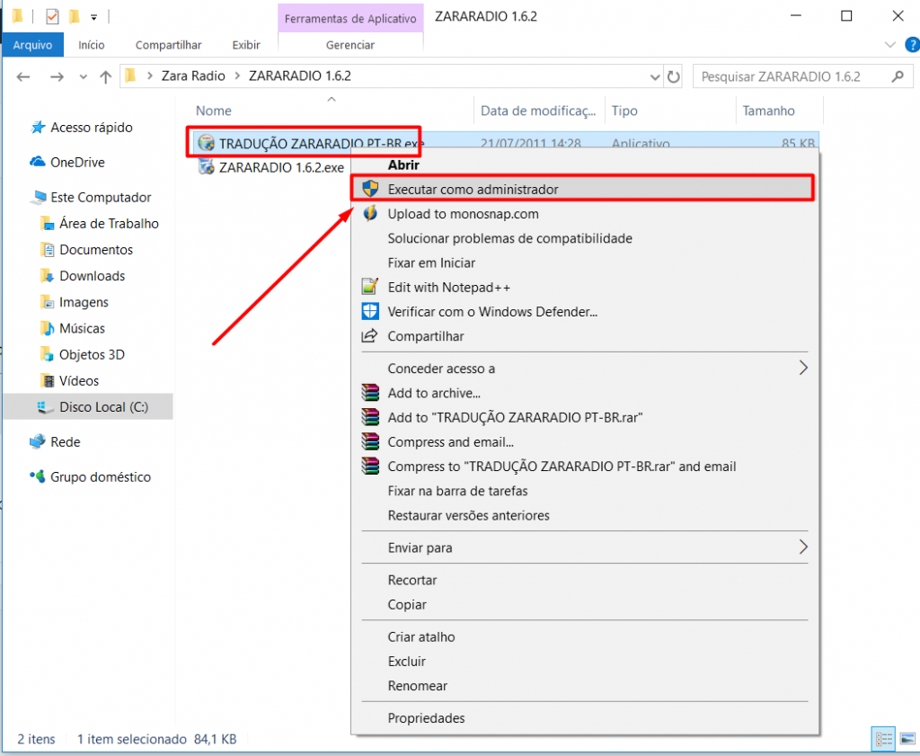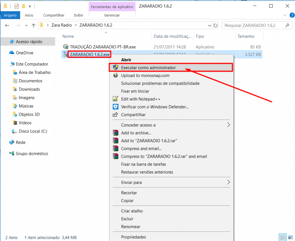 Passo 1 – Após baixar o ZaraRadio, procure pelo ícone de instalação, clique com o botão direito sobre ele, escolha a opção: “Executar como administrador“. Caso apareça alguma notificação do Windows perguntando se permite a execução do Software, clique em “Sim” ou “Permitir“.