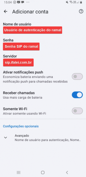 4.Preencha os campos conforme os dados do seu ramal no PABX: