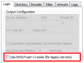 1-Se você for transmitir conectado na porta do streaming(diretamente ao streaming) você deverá deixar a caixa Use Shoutcast v1 mode desmarcada como na imagem abaixo contornada em vermelho.