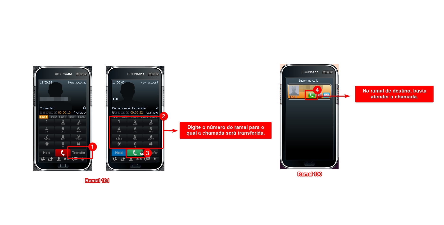 1) – Para isto, basta clicar no botão “Transfer“, digitar o número do ramal desejado para transferir a ligação e clicar em “Ligar“.
